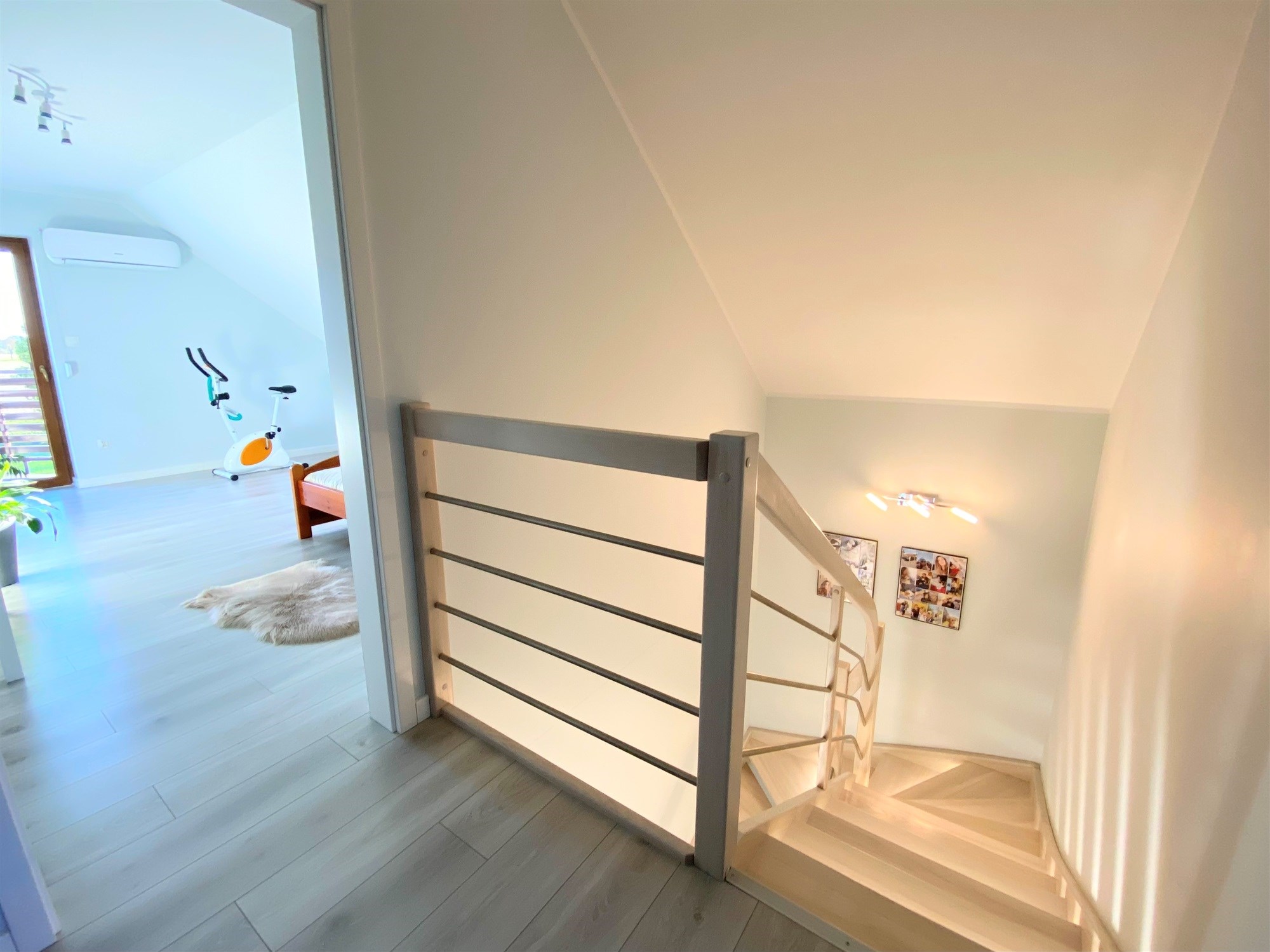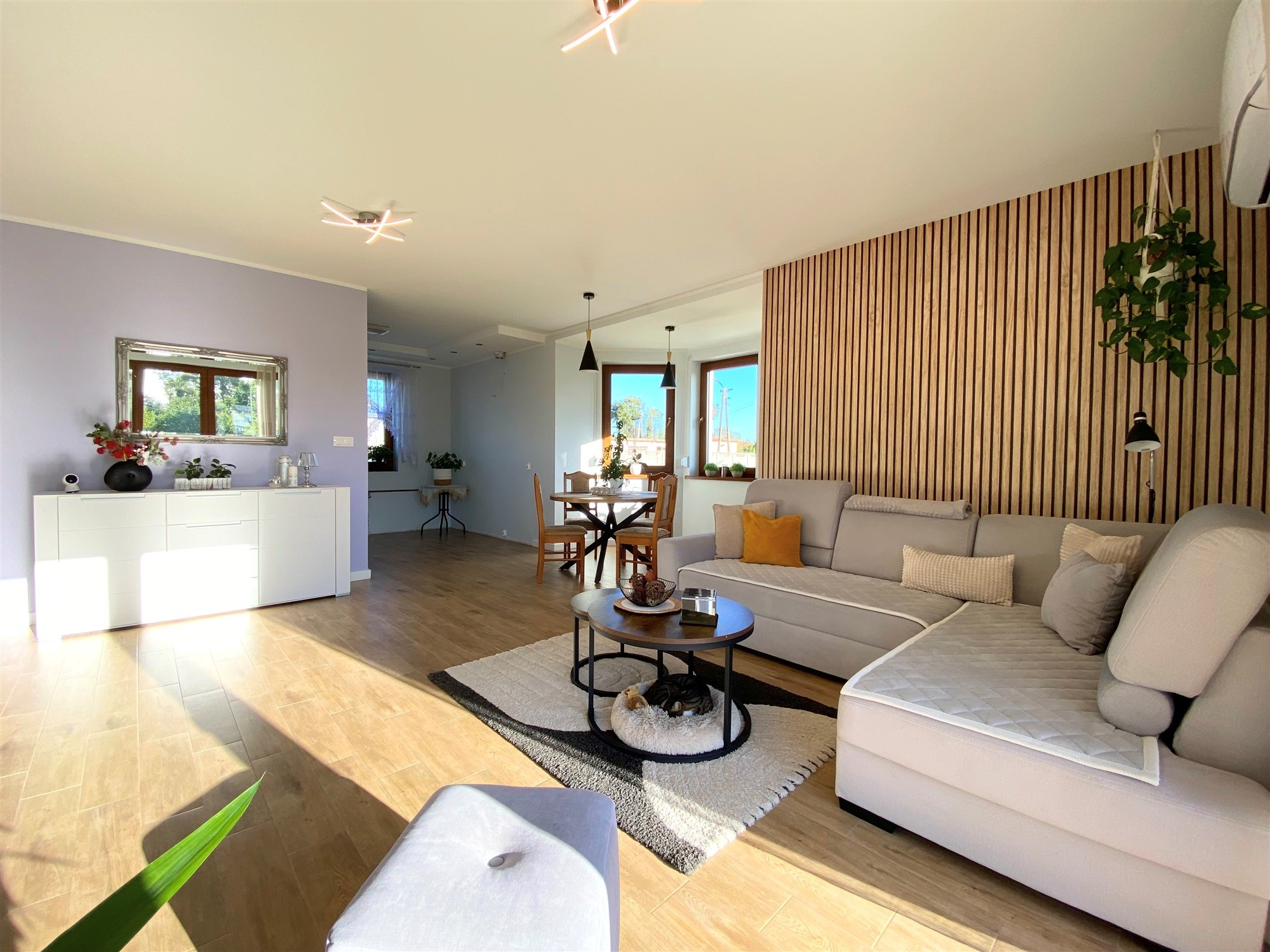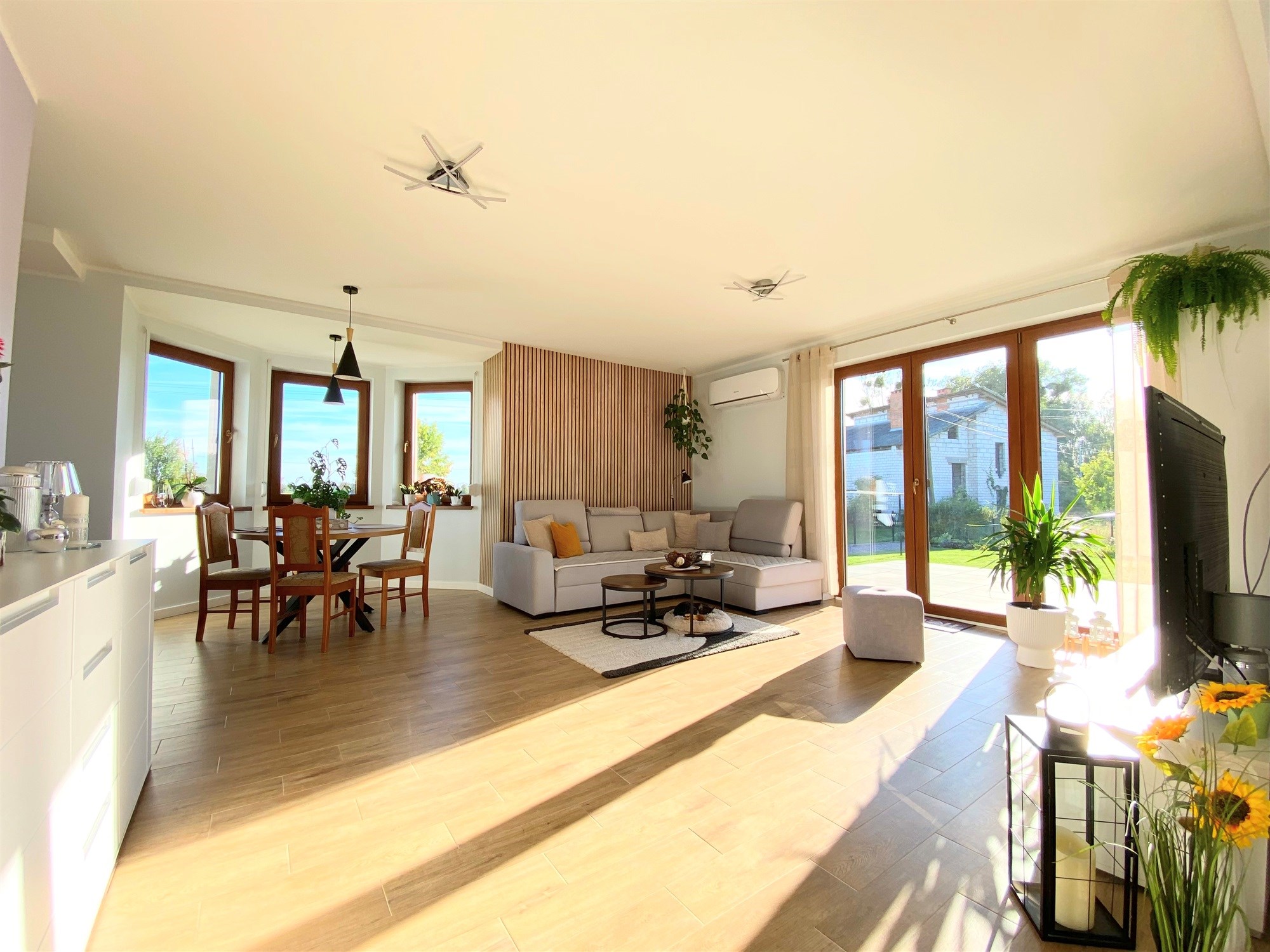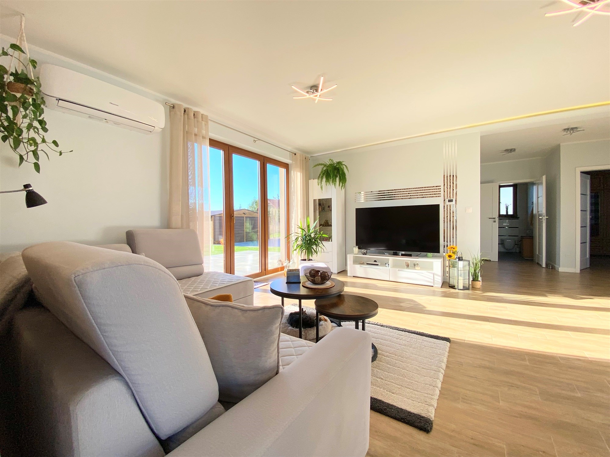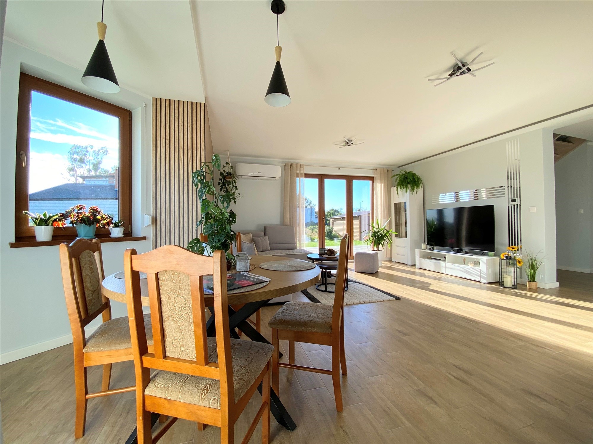 Dom ogrzewany kotłem gazowym zasilanym z sieci miejskiej. W salonie oraz w sypialni na górze zamontowana klimatyzacja. Okna 3-szybowe. W każdym oknie rolety zewnętrzne.