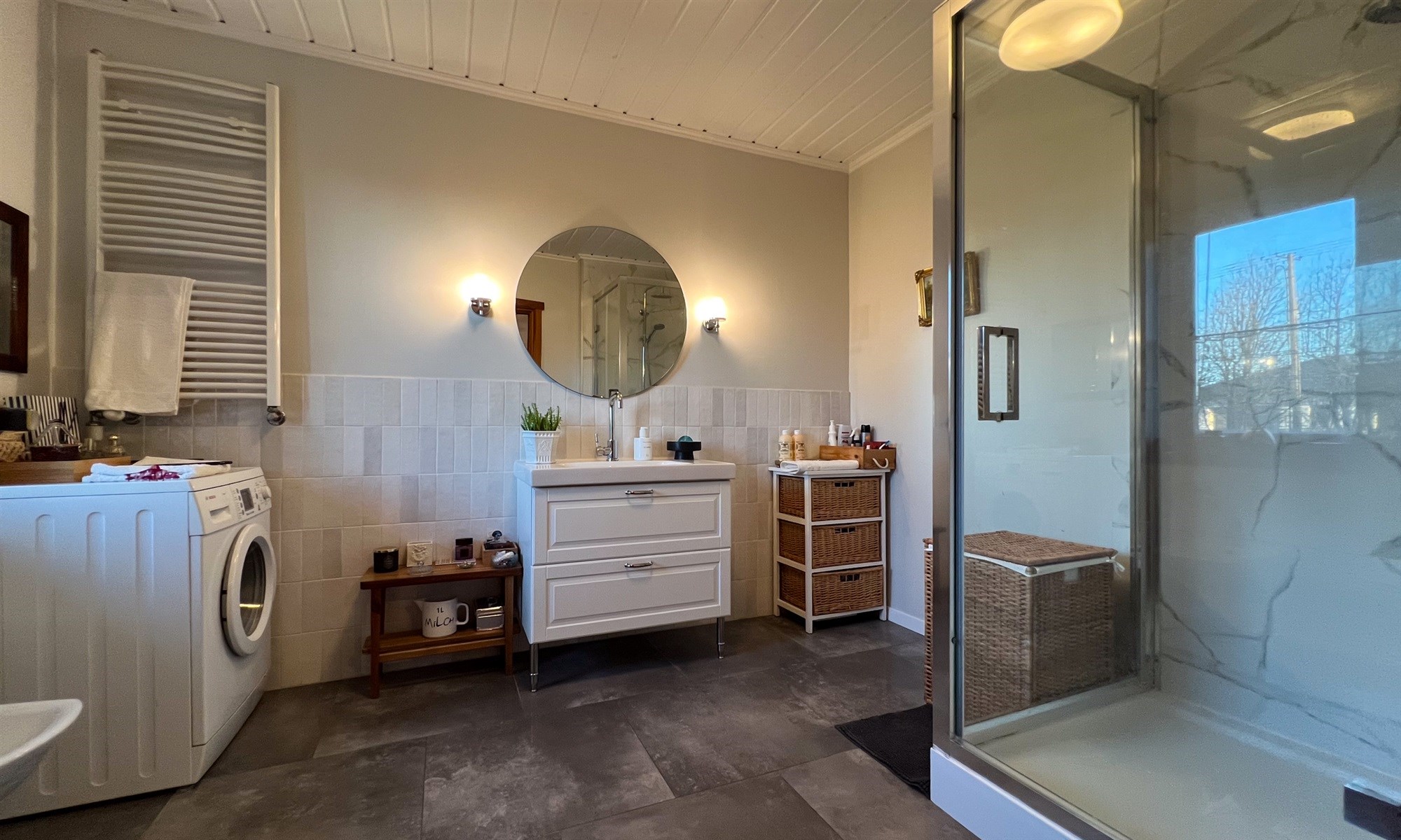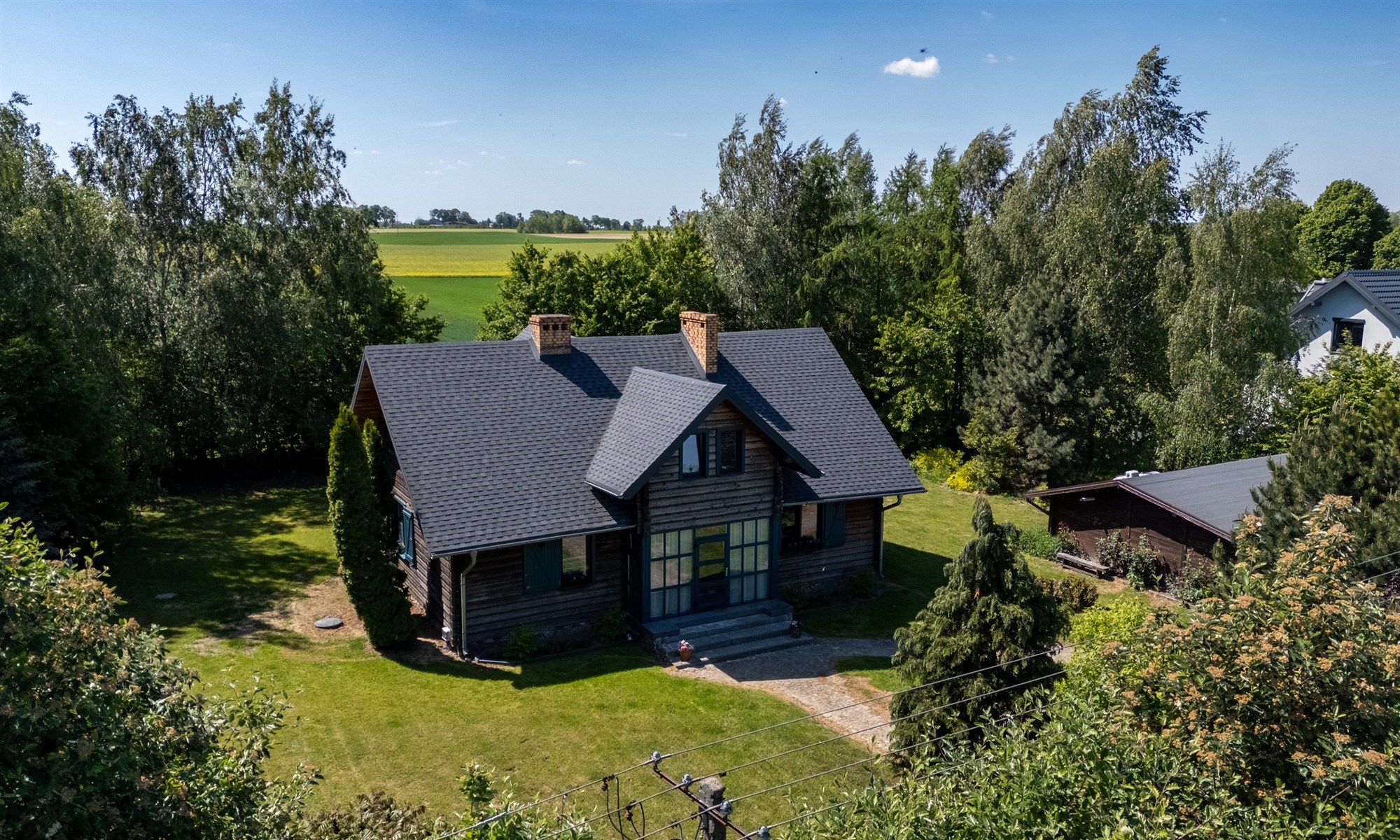 podzieloną na funkcjonalne strefy. Znajdziesz tu przestronny salon z wygodnym miejscem do pracy lub wypoczynku przy kominku, jadalnię z dużym stołem oraz półotwartą kuchnię ze spiżarnią. Całość uzupełnia praktyczna łazienka oraz weranda. Z salonu wyjdziesz bezpośrednio na taras, który otaczają kilkunastoletnie drzewa, zapewniając niezwykłe poczucie prywatności i bliskości natury.