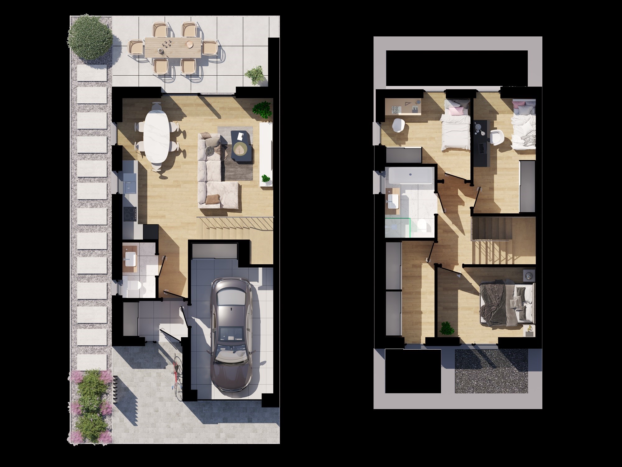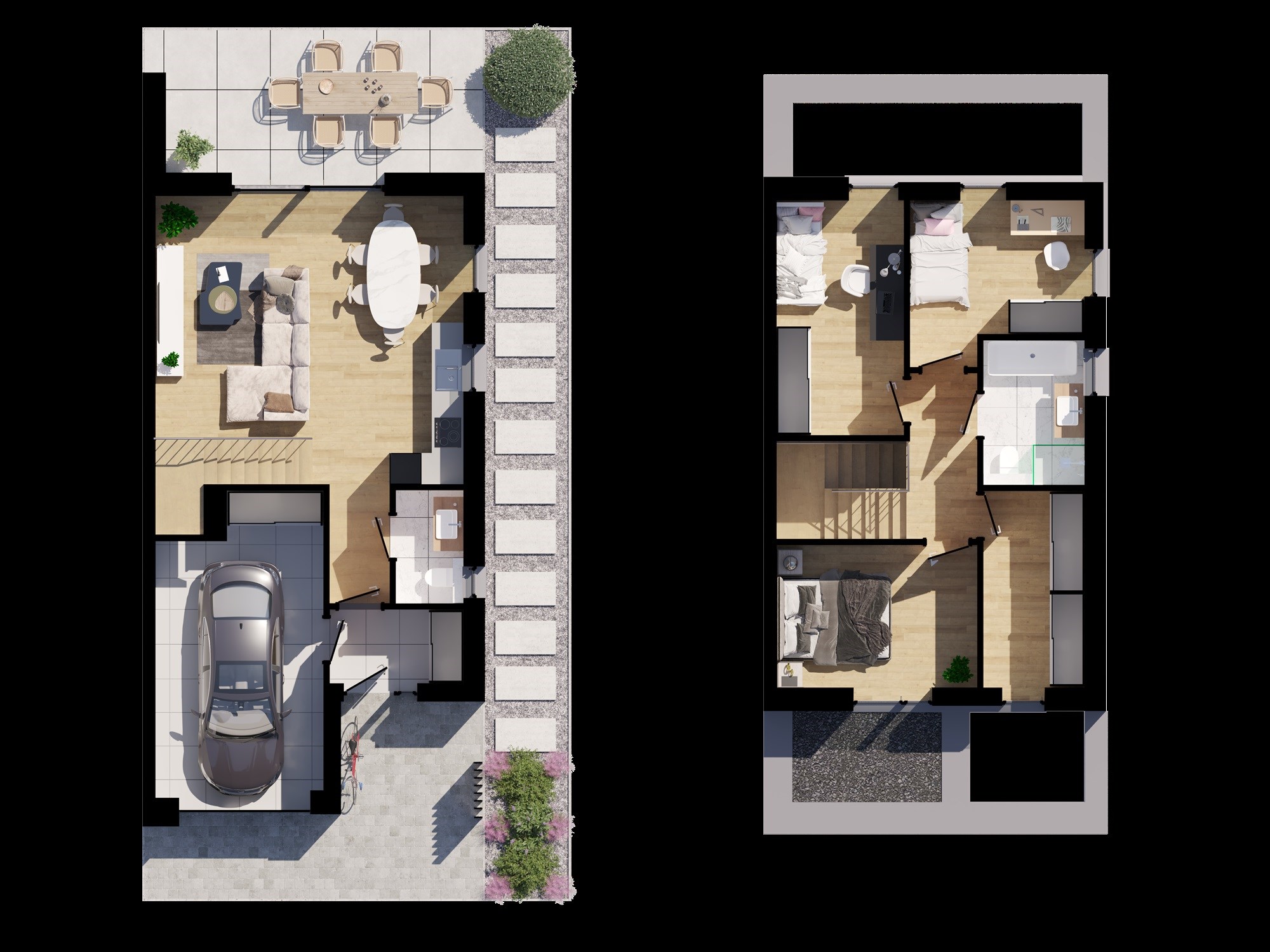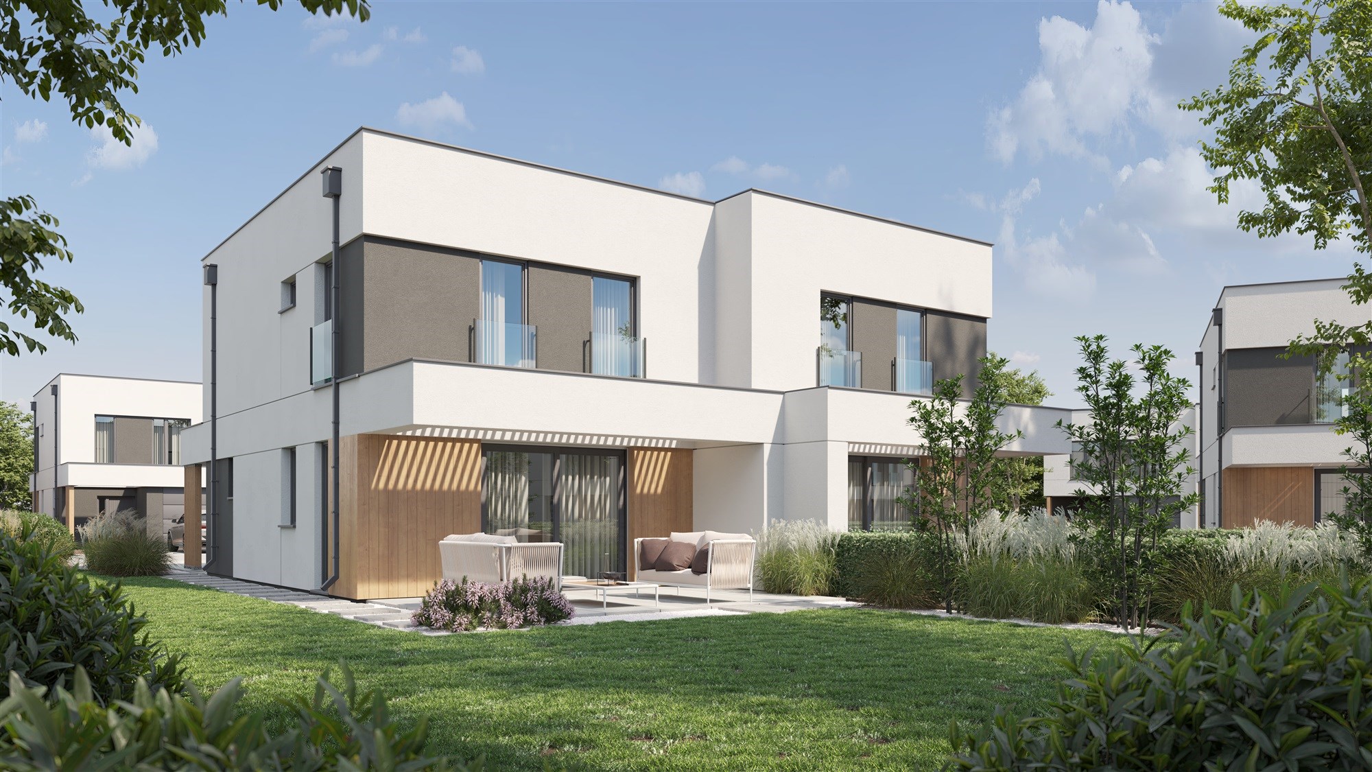 Domy w zabudowie bliźniaczej o powierzchni 108,6 m² (parter + piętro) usytuowane są na działkach od 406m² do 420m².