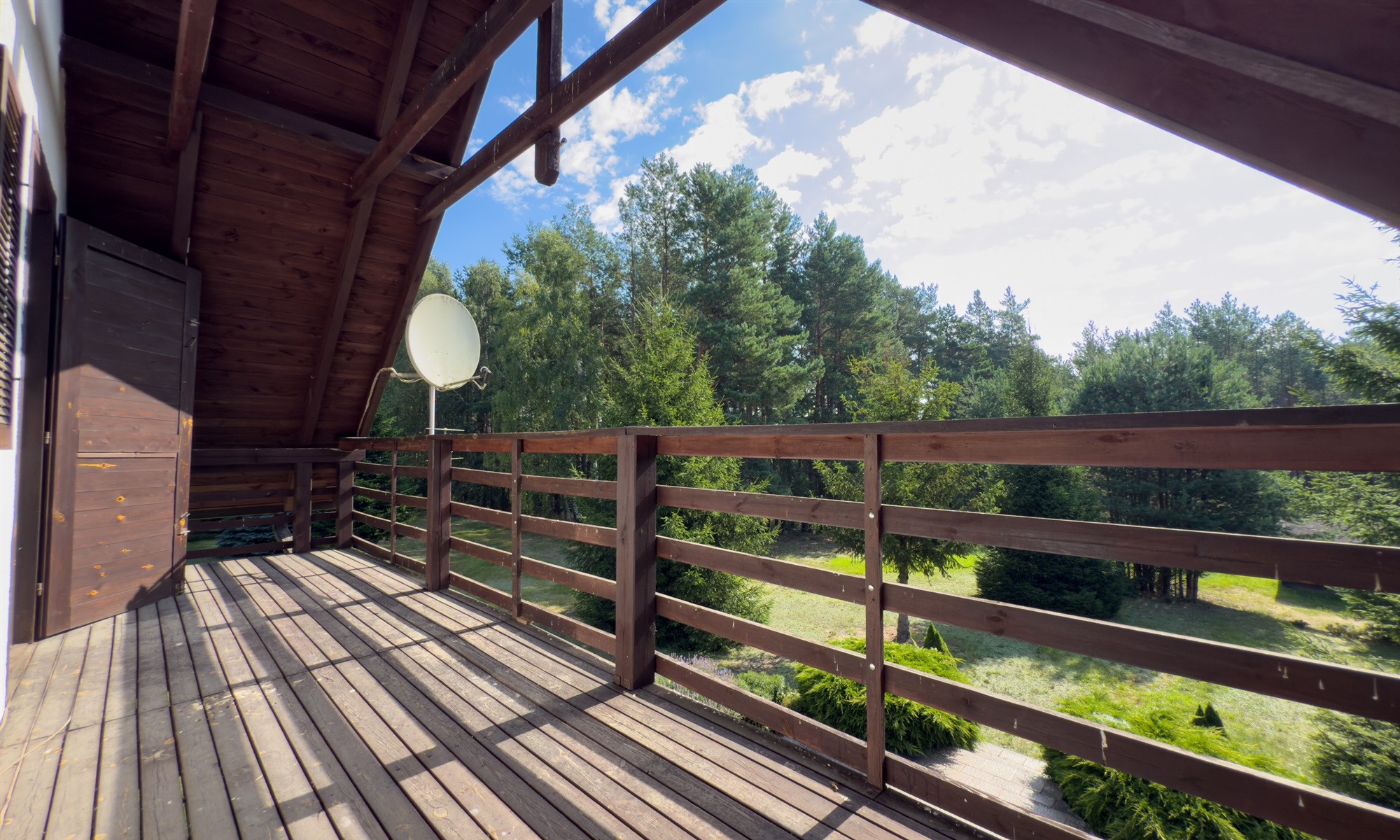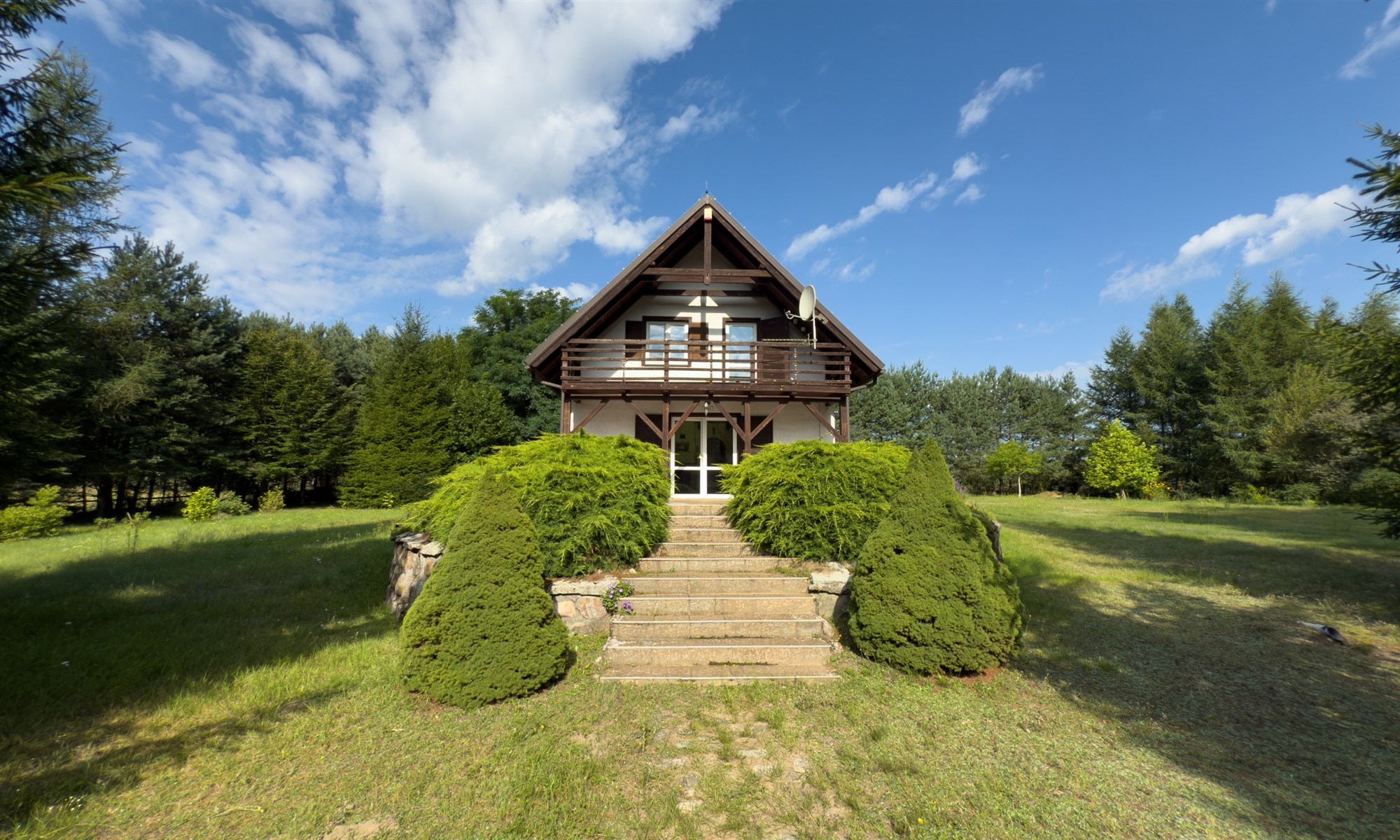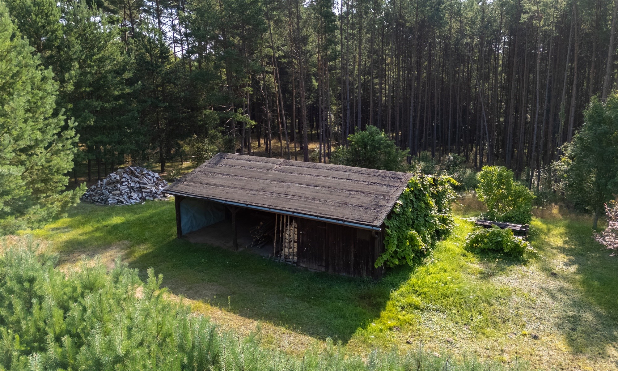 Ogromnym atutem tej nieruchomości jest bardzo duża działka o powierzchni aż 2,5 ha (dokładnie 2,5646 m²). Dom otoczony jest własnym lasem, co gwarantuje całkowitą prywatność i spokój. Teren jest ogrodzony drewnianym płotem i w pełni przygotowany do rekreacji na świeżym powietrzu. Znajduje się tu miejsce na ognisko, drewniany budynek gospodarczy z drewutnią i częścią gospodarczą, a także duży taras, który świetnie sprawdzi się podczas spotkań z bliskimi, lub wieczornego relaksu i podziwiania gwiazd. To miejsce daje ogromne możliwości – od stworzenia ogródka warzywnego, czy zbierania grzybów na własnym terenie, przez budowę sauny lub ustawienie jacuzzi, aż po relaks w hamaku zawieszonym między drzewami, czy nawet wykonywanie pracy zdalnej z widokiem lasu za oknem.