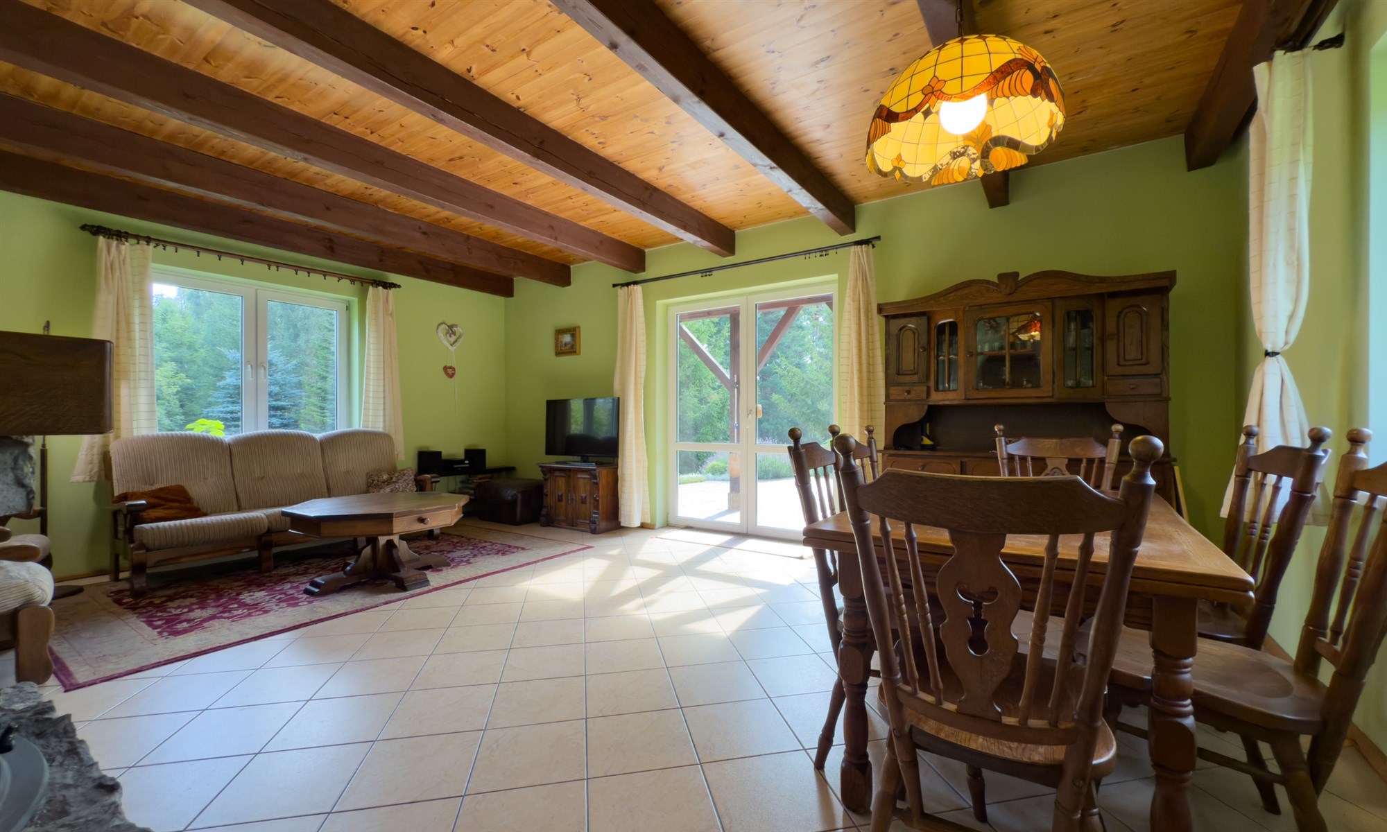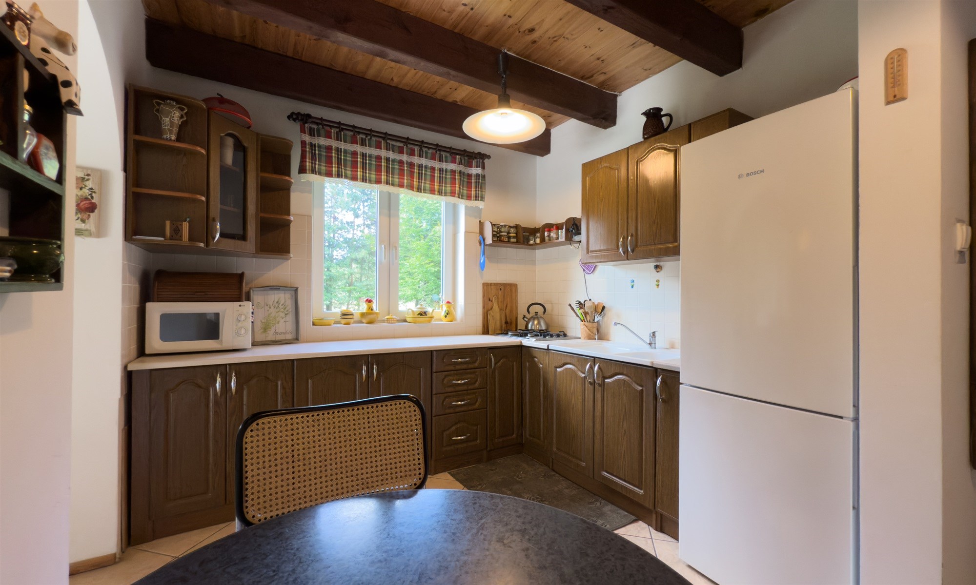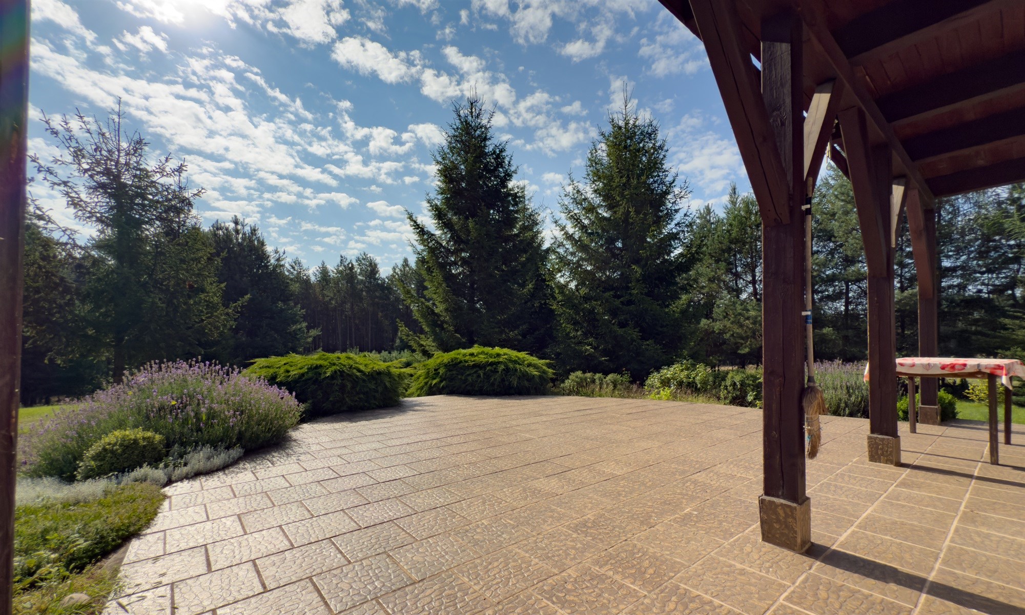 Ogromnym atutem tej nieruchomości jest bardzo duża działka o powierzchni aż 2,5 ha (dokładnie 2,5646 m²). Dom otoczony jest własnym lasem, co gwarantuje całkowitą prywatność i spokój. Teren jest ogrodzony drewnianym płotem i w pełni przygotowany do rekreacji na świeżym powietrzu. Znajduje się tu miejsce na ognisko, drewniany budynek gospodarczy z drewutnią i częścią gospodarczą, a także duży taras, który świetnie sprawdzi się podczas spotkań z bliskimi, lub wieczornego relaksu i podziwiania gwiazd. To miejsce daje ogromne możliwości – od stworzenia ogródka warzywnego, czy zbierania grzybów na własnym terenie, przez budowę sauny lub ustawienie jacuzzi, aż po relaks w hamaku zawieszonym między drzewami, czy nawet wykonywanie pracy zdalnej z widokiem lasu za oknem.