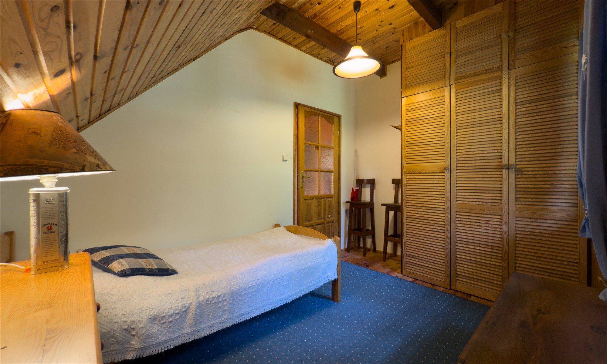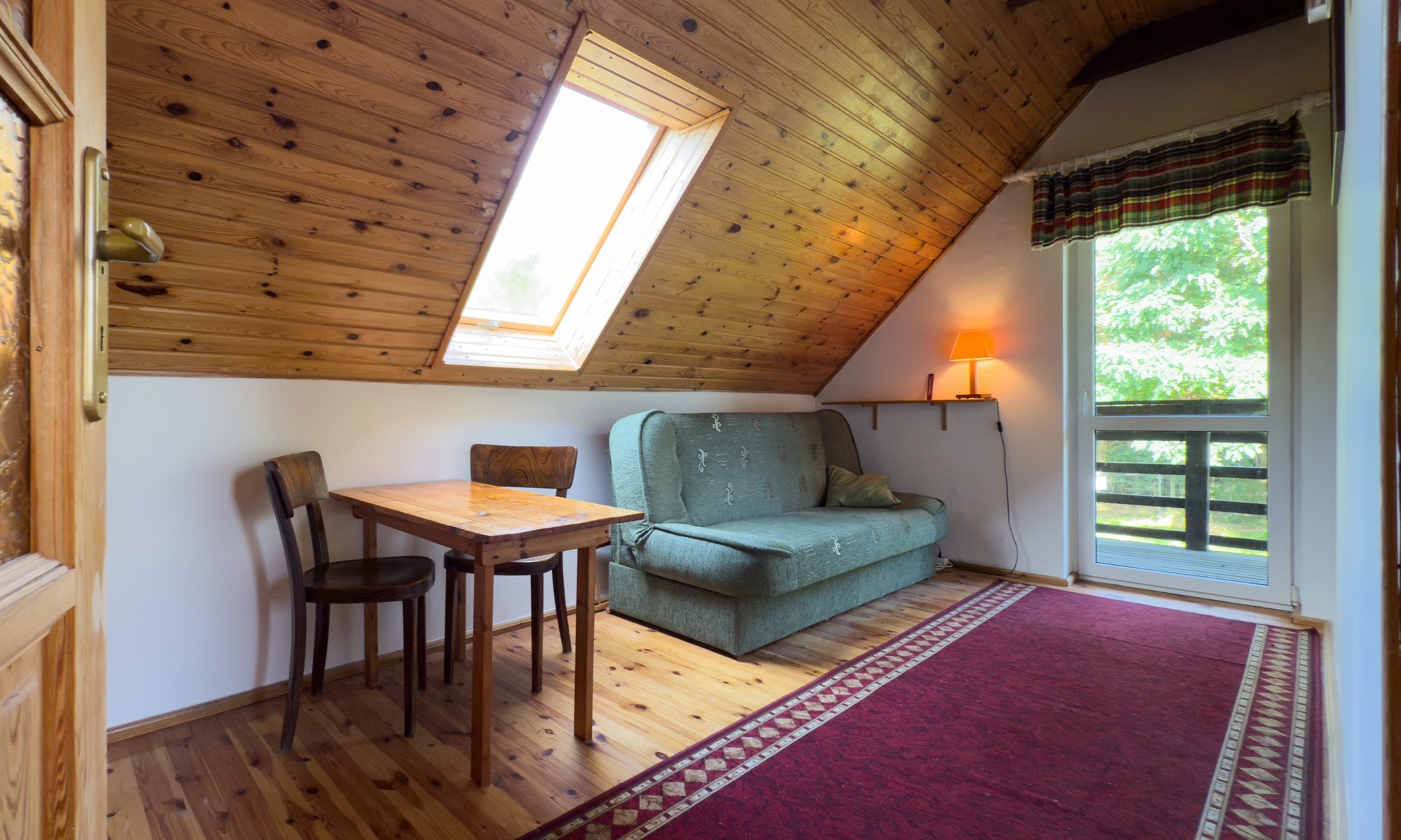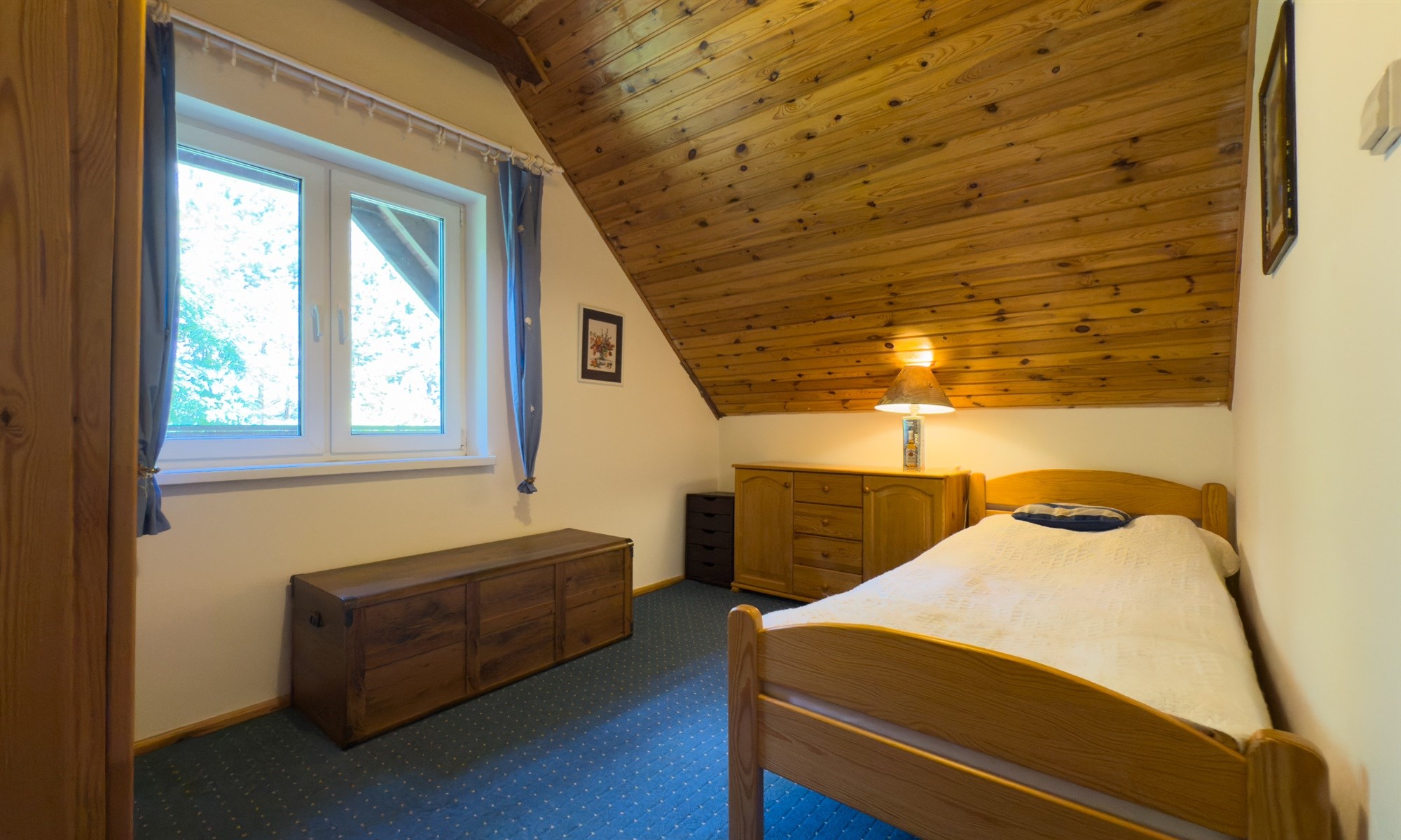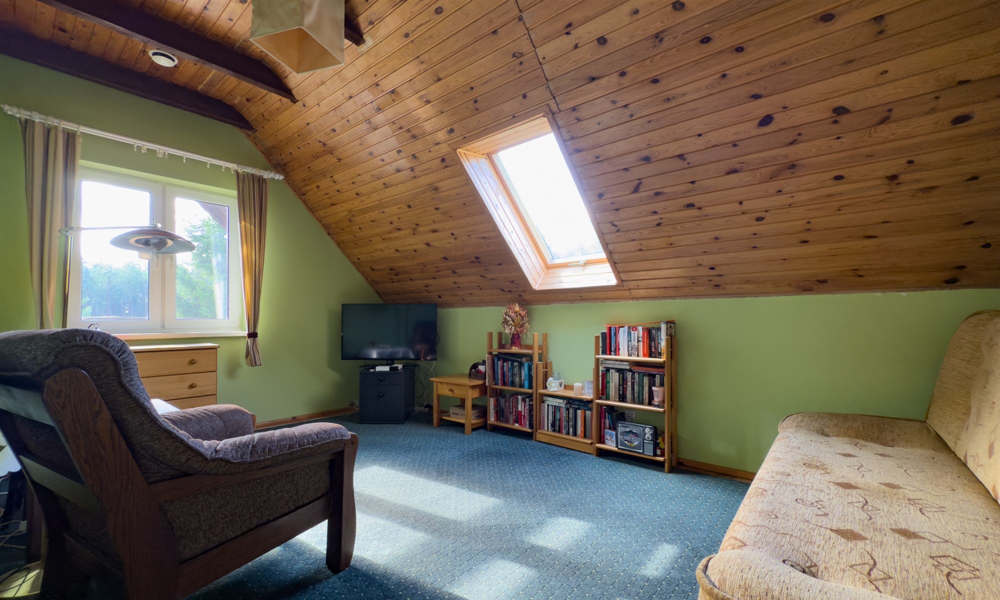 Piętro to cztery sypialnie, a z dwóch z nich można wyjść na zadaszone balkony, gdzie w spokoju odpoczniesz z książką lub filiżanką kawy, podziwiając otaczający las. Dodatkowo dom posiada poddasze, które pełni funkcję praktycznej przestrzeni do przechowywania.