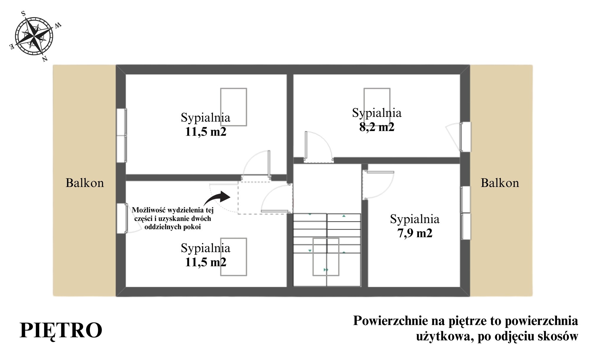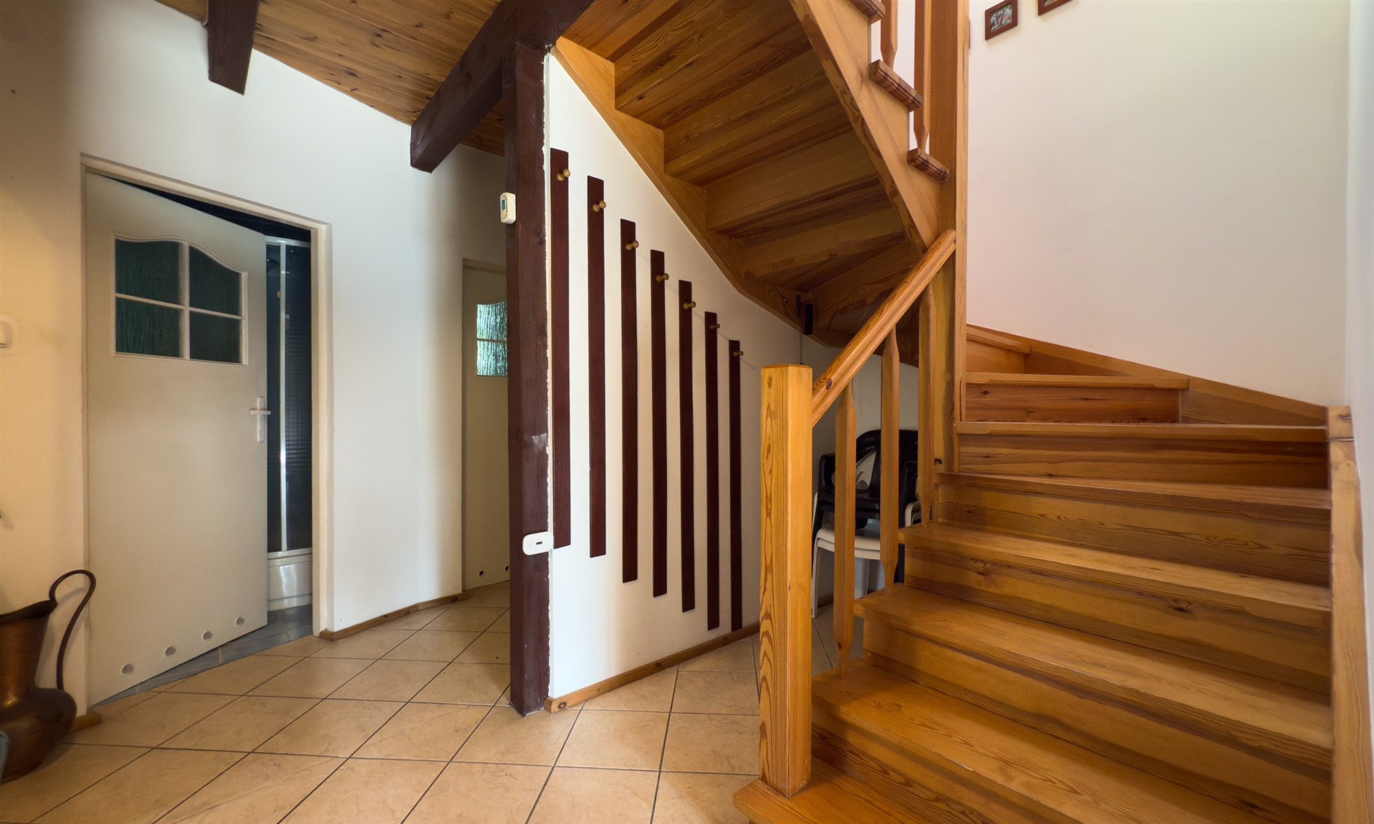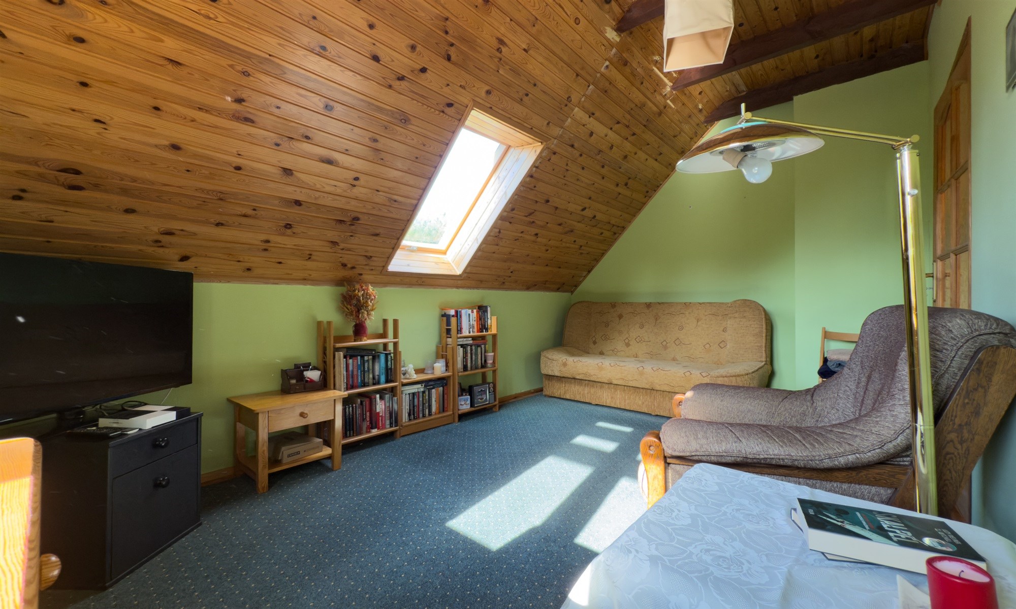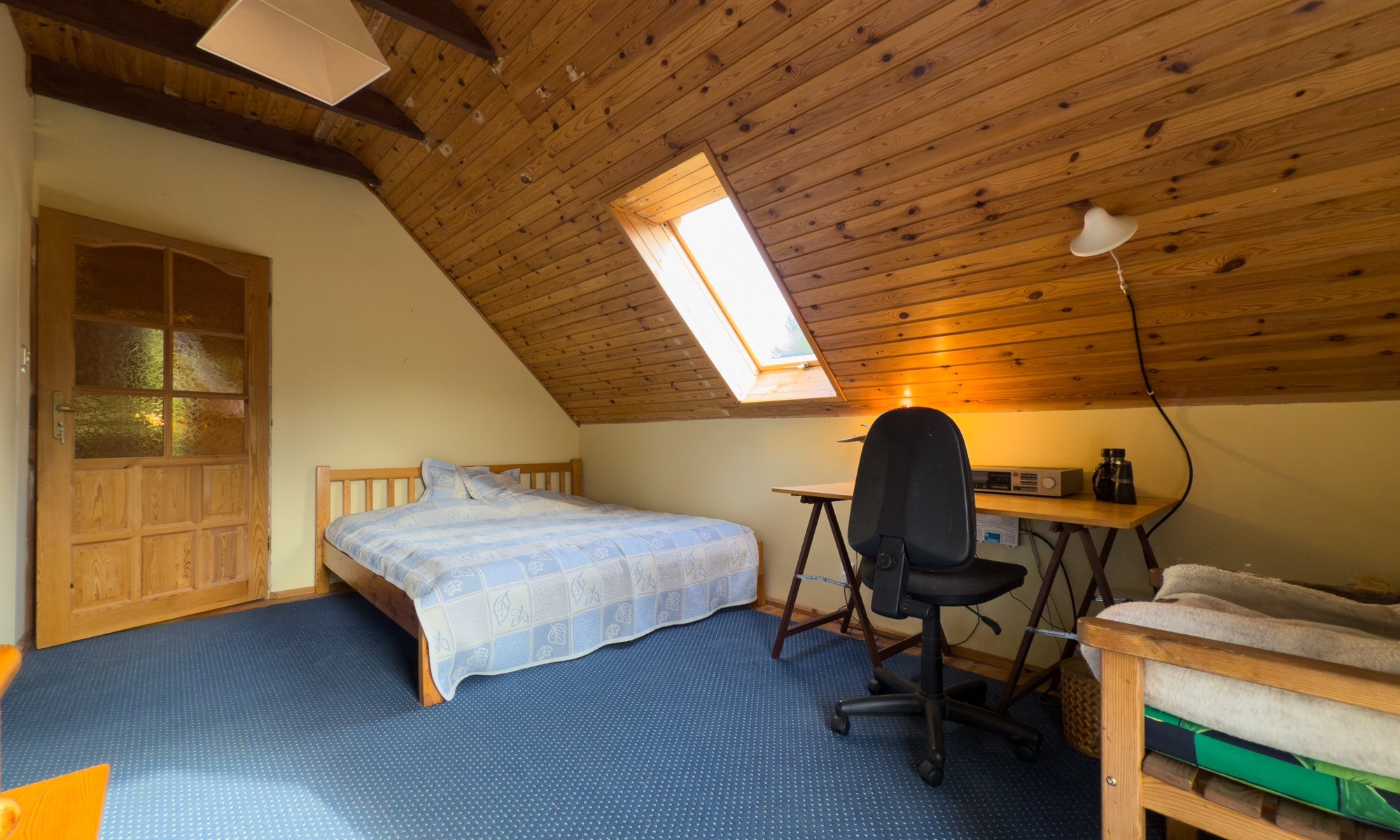 Piętro to cztery sypialnie, a z dwóch z nich można wyjść na zadaszone balkony, gdzie w spokoju odpoczniesz z książką lub filiżanką kawy, podziwiając otaczający las. Dodatkowo dom posiada poddasze, które pełni funkcję praktycznej przestrzeni do przechowywania.